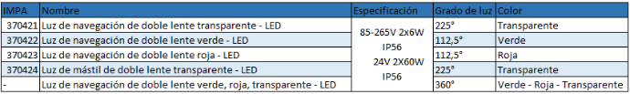 Disponible en lente verde, roja y transparente, según la función de señalización requerida. Corresponde a los códigos IMPA 370421 a 370424 y utiliza tecnología LED, ofreciendo una solución eficiente y de larga vida útil para aplicaciones navales.